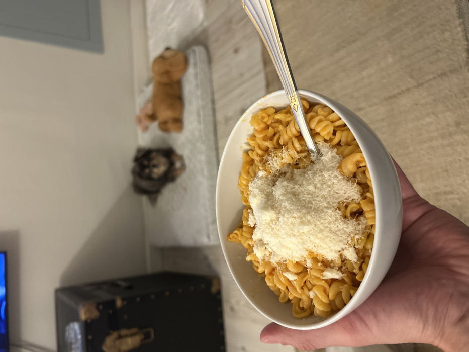 - "A person's hand holds a white bowl of orange-tinted spiral pasta topped with a generous mound of grated white cheese and a silver spoon, observed in a domestic setting in Holon, Israel" by FM-u366Z2, licensed under CC BY 4.0