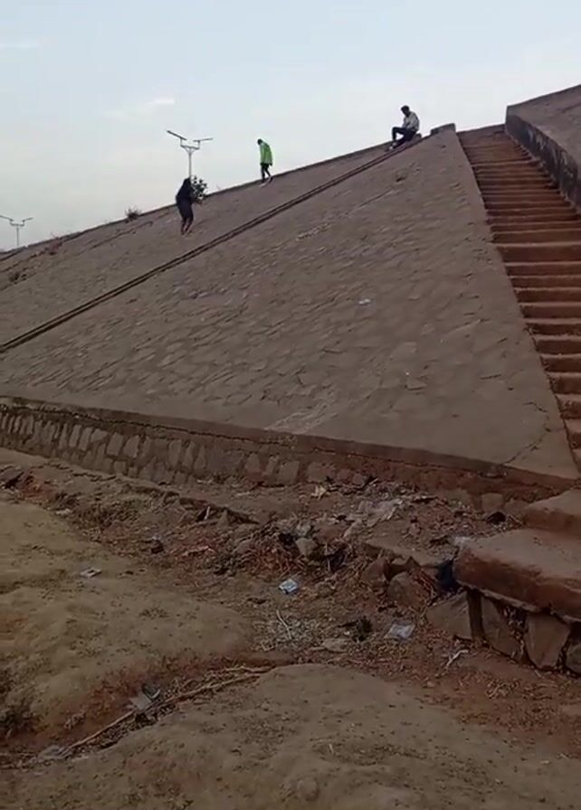 wide shot of a slope covered in stone with a set of stairs on the right side. Four people are seen on the slope. One is seated towards the top, while the other three are walking. The person closest to the stairs is wearing green. Another is wearing a dark outfit, and the furthest person is wearing red. The area at the bottom of the slope is dirt covered, with some litter scattered throughout. There are streetlights visible at the top of the slope. The sky is mostly clear with a few clouds.