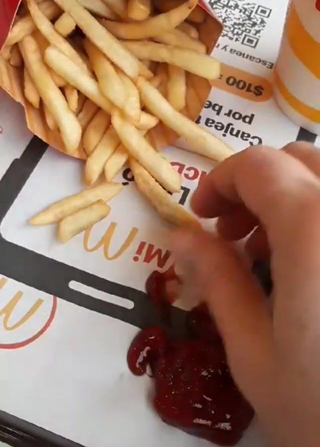 On a McDonald's tray with printed graphics, a red container of french fries tips, with fries spilling out. A hand dips a fry into a pool of ketchup on the tray. A cup is visible in the upper right corner of the frame.