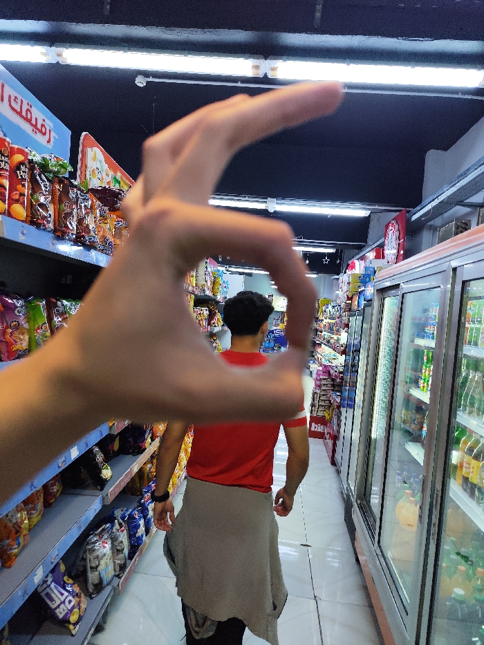 The image captures an indoor retail environment, identified as a supermarket within Joubar Municipality, Syria. The foreground is dominated by a light-skinned left hand, which is held up, forming a heart shape with the thumb and index finger. Through this heart-shaped frame, a male individual is visible from behind, walking away from the camera down a brightly lit aisle. This individual has dark, short, curly hair and is wearing a red short-sleeved t-shirt featuring a white stripe on the right sleeve. A light-colored garment is tied around his waist, and a dark wristband is present on his left wrist. To the left of the aisle, multiple shelves are stocked with various packaged snack products, displaying colorful wrappers and at least one sign with Arabic text, including "رفيقك". To the right, a row of vertical glass-fronted commercial refrigerators contains assorted bottled and canned beverages. The ceiling is dark, featuring multiple parallel fluorescent light fixtures that illuminate the scene. The floor is light-colored and tiled.