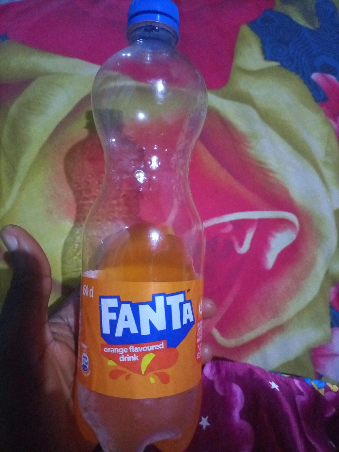 - "A hand holds a partially empty plastic bottle of Fanta orange soda against a blurred floral patterned background" by FM-6dl0n1, licensed under CC BY 4.0