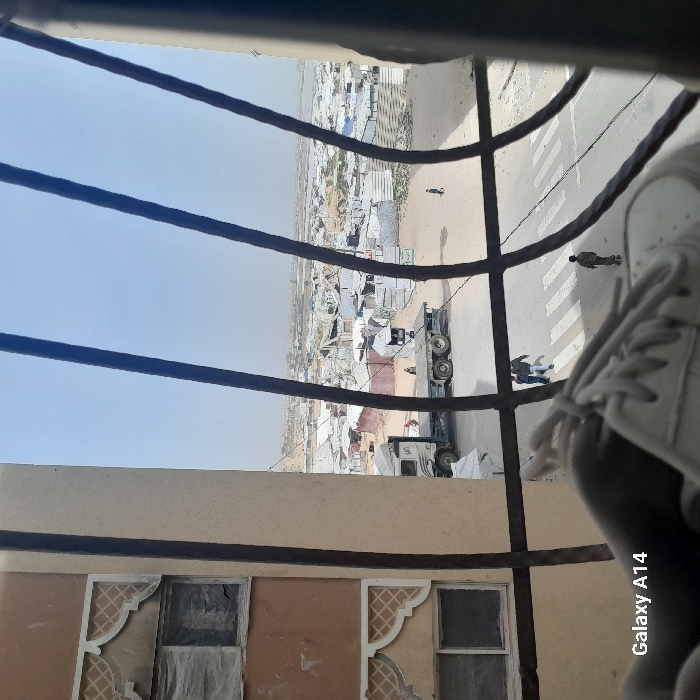 The image, captured from an elevated perspective in Khan Yunis, Palestinian Territory, looks through four dark, vertical metal window bars. In the immediate foreground, the toe and laces of a white shoe are partially visible. To the left, a section of a light brown building features decorative window moldings; one visible window on the second floor is obscured with sheeting. Below, an asphalt street with a white pedestrian crosswalk is visible. A grey flatbed truck is parked on a dirt area adjacent to the street; a small red object (possibly a person) is on its bed, and another individual is standing near the truck's cab. Two people are walking across the white pedestrian markings on the street, while a third individual walks on the street further to the right. The background reveals an extensive informal settlement, characterized by a dense array of makeshift shelters, tents, and structures constructed from various materials, stretching across the landscape towards a hazy horizon. The sky is a light, somewhat dusty blue. The text "Galaxy A14" is present in the lower-left corner of the image.