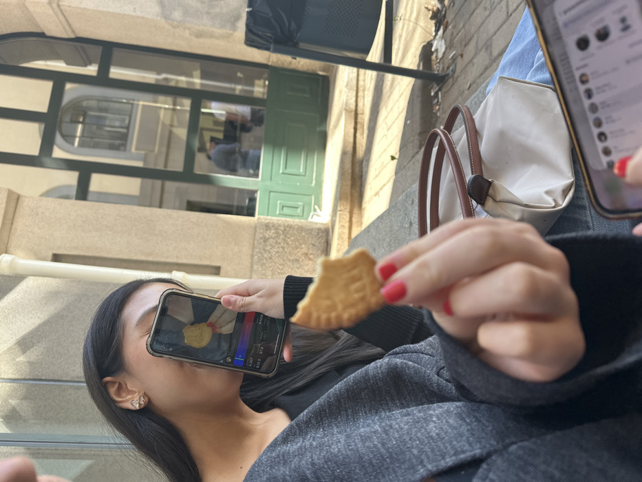 This image depicts a sunlit outdoor scene featuring two individuals near a building. In the foreground, a person's hands are visible. The right hand, with bright red nail polish, holds a partially eaten Maria biscuit. The left hand, also with red nail polish, holds a smartphone displaying a messaging application interface. A beige handbag with brown straps rests near the individual's lap, which is covered by blue denim jeans and a dark grey garment. In the middle ground, another individual, identified as female, with long dark hair and a dark top, holds a smartphone with a clear case to her face, partially obscuring it. A gold-colored earring is visible on her right ear. The phone's screen displays an image of hands holding a yellow, irregularly shaped food item, possibly a fried egg, on a dark surface, with digital interface elements at the bottom. Her visible hand also exhibits red nail polish. The background features a light-colored stone building with traditional architectural elements. A prominent dark green-framed glass door, composed of multiple panes and solid lower panels, stands at the top of stone steps. Two indistinct male figures are reflected within the glass door, suggesting they are inside the building. A white vertical pipe runs down the building's facade on the left. A black metal trash can with a black plastic liner is situated to the right of the steps. Strong shadows across the ground and building indicate bright daytime conditions. The architectural style, characterized by the stone facade, green multi-pane door, and classical building elements, is highly consistent with structures found within the **Universidad Complutense de Madrid (UCM) campus in Madrid, Spain**, particularly resembling the Faculty of Philology (Facultad de Filología).