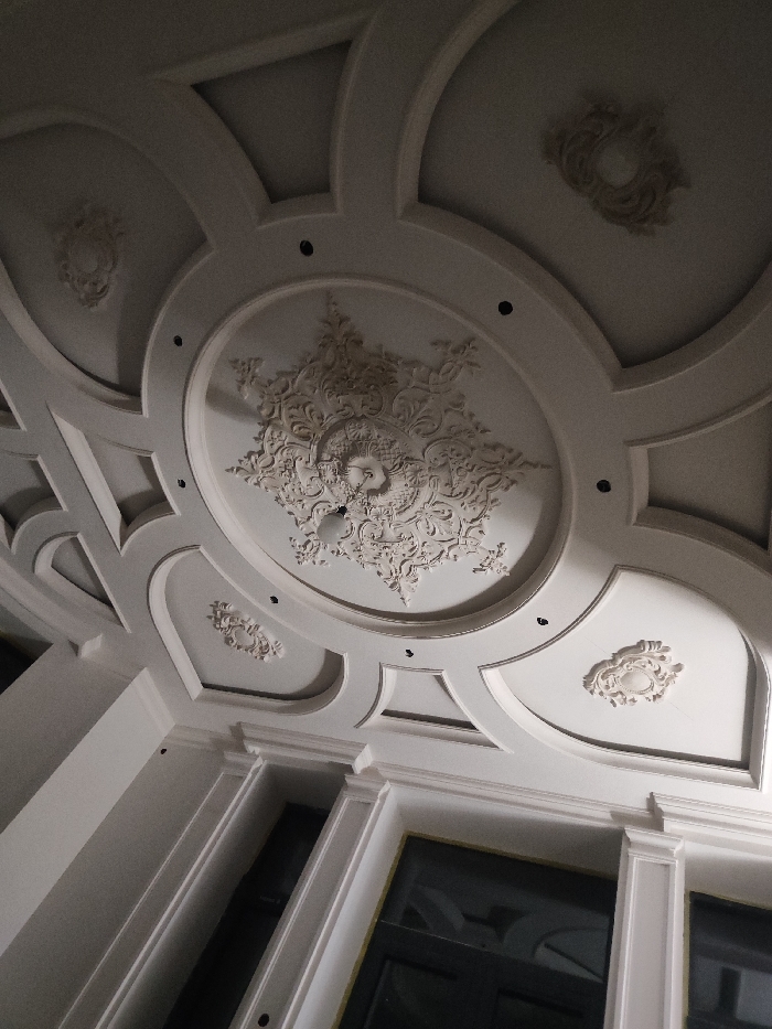 The image depicts an interior architectural space in Samarkand City, Uzbekistan, focusing on a highly ornate, light-colored ceiling. The ceiling features extensive white plasterwork, centrally dominated by a large oval medallion exhibiting intricate, deeply carved floral and scroll motifs. This central piece is surrounded by recessed panels and arches, creating a segmented design across the ceiling. Smaller, decorative rosettes are present within some of the surrounding recessed areas. Several small, circular black openings, consistent with recessed lighting fixture placements, are visible. A single, bare incandescent light bulb hangs from the center of the main medallion. The lower portion of the frame shows a transition to vertical walls, defined by architectural molding or pilasters that frame large, dark rectangular sections, likely windows or doorways. No individuals, actions, or interactions are visible. The lighting is subdued, highlighting the three-dimensional relief of the plasterwork.