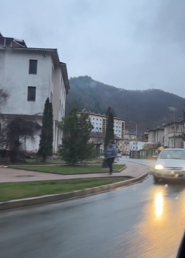 drive through a small town on a rainy day. The road is wet and reflects the overcast sky. Buildings line the street, including a large, white, multi-story building with many windows. In the background, a forested mountain is visible. A silver car drives past, and a person can be seen walking on the sidewalk. The camera is inside a car, capturing the view from the window as it passes by.