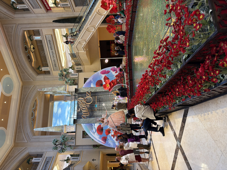 The image depicts an ornate indoor setting, possibly a shopping mall or hotel. Several people are gathered near an advertisement for "The Wizard of Oz," which features a large backdrop with an image of Dorothy. Artificial red poppies border a water feature. The architecture includes arched walkways, an escalator, and decorative lighting fixtures. The color palette is dominated by beige and red.