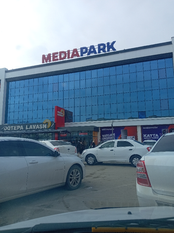 A photo shows a large building with "MEDIAPARK" in red and blue on its roof. A massive blue-windowed facade dominates the building's front. Several cars occupy the foreground, including a silver sedan and two white sedans. A fast food restaurant, "QOQTEPA LAVASH", is visible to the left of the main entrance. People are seen walking near the entrance.
