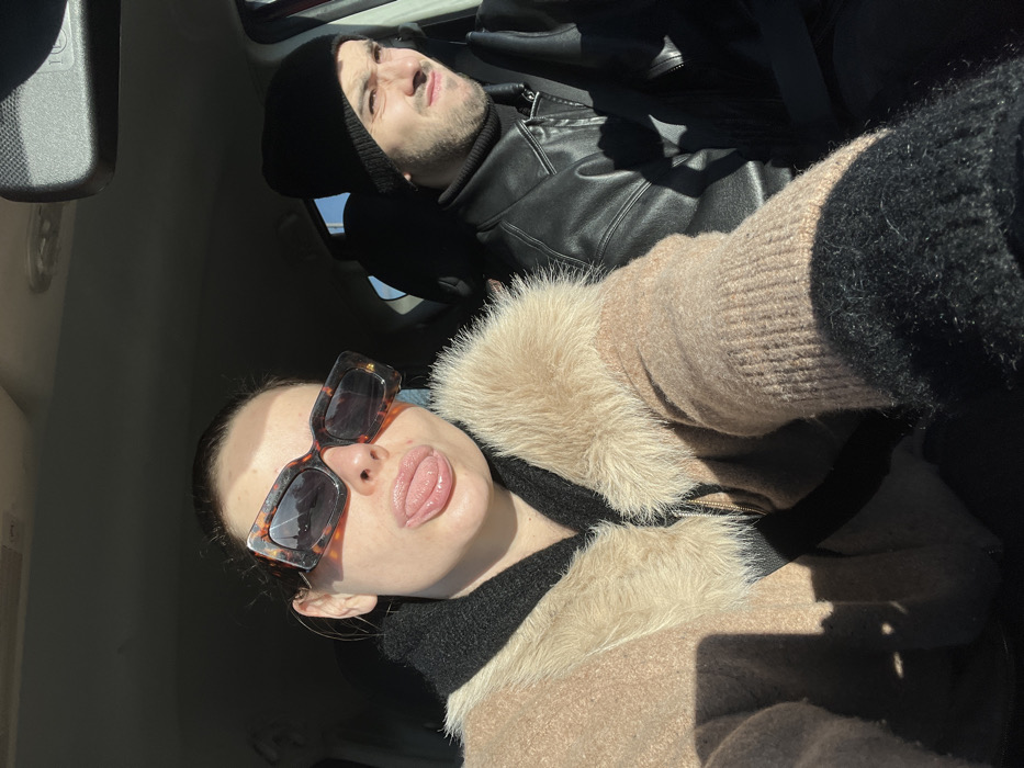 The scene takes place inside a vehicle in Marquette-lez-Lille, France, illuminated by strong, direct sunlight. A female passenger, positioned on the left, faces the camera. She wears large, tortoise-shell framed sunglasses, a light brown knitted garment with a light-colored faux fur collar, and a black garment underneath. Her mouth is open with her tongue slightly extended. To her right, in the driver's seat, a male individual is present. He wears a black knitted beanie, a black leather-like jacket over a black turtleneck, and has facial hair. His gaze is directed forward and slightly to the right, with a squinted or grimacing expression. The sun creates distinct shadows across the subjects and the gray interior of the vehicle, highlighting the passenger compartment. A rear-view mirror is visible above and between the individuals.