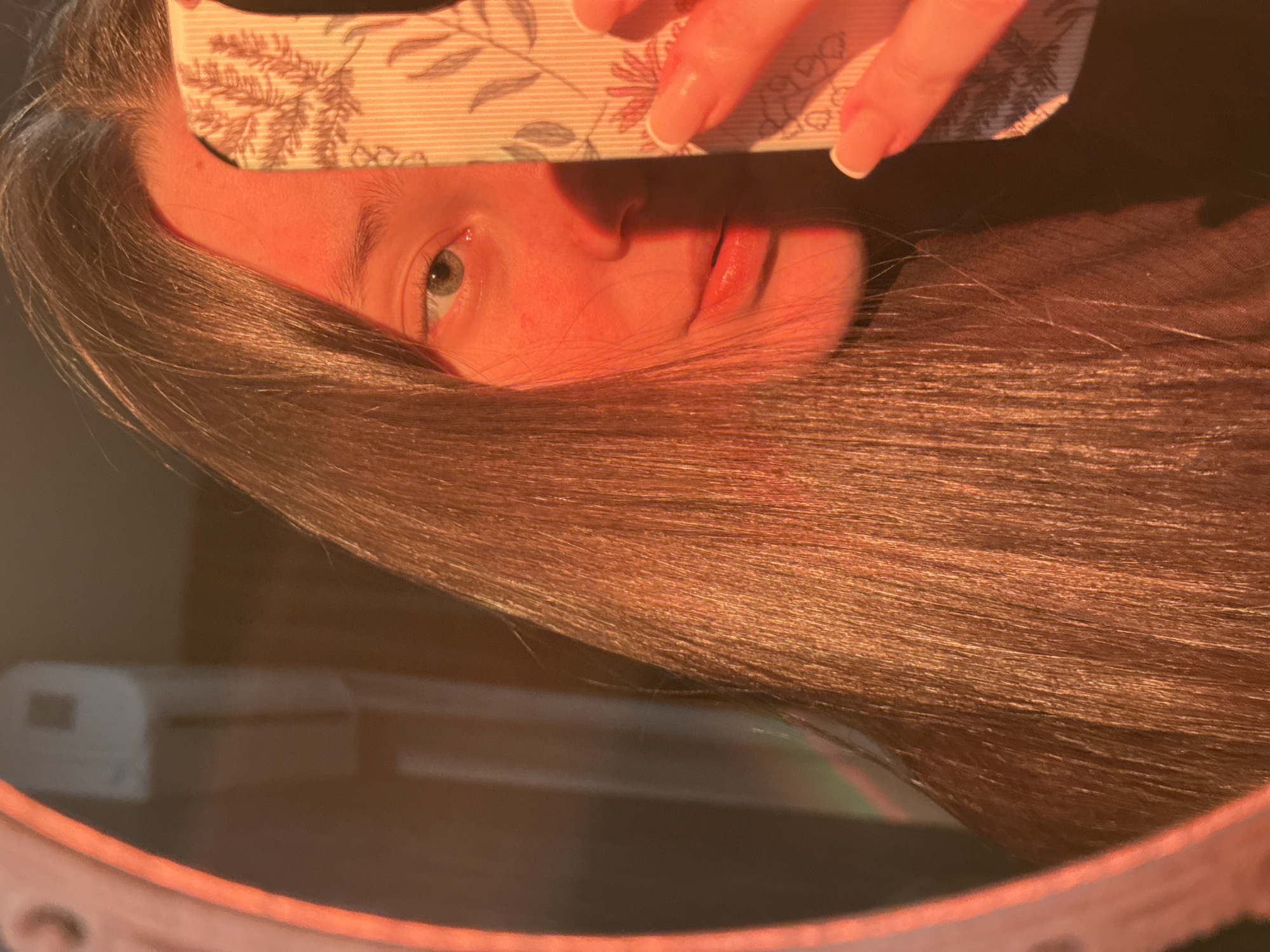 The image is a portrait of a fair-skinned person with long, brown hair partially covering their face