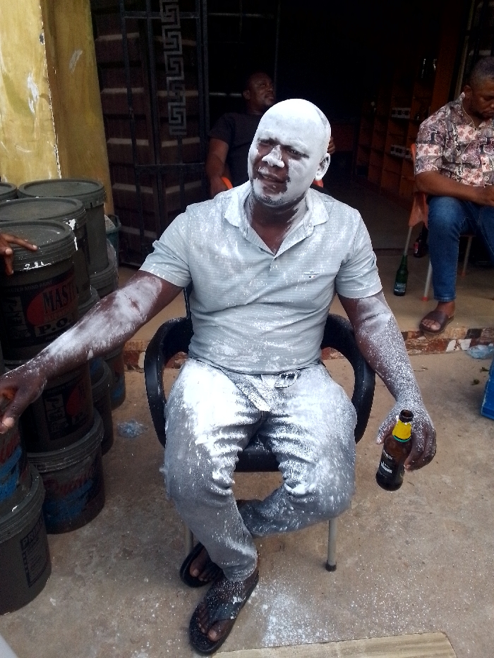 An adult male is seated in a black plastic chair, extensively covered in white powder, in what appears to be an outdoor or semi-open urban area in the city of Unknown, Unknown. The male, of African descent, wears a light grey polo shirt, grey jeans, and black flip-flops. White powder adheres to his entire head, face, neck, arms, chest, and legs, as well as his clothing and the chair. He holds an amber-colored beer bottle with a yellow label in his right hand, displaying a slight grimace or smirk towards the camera. Two other adult males are present in the background. One is seated to the right of the primary subject, wearing a patterned shirt, blue jeans, and brown flip-flops, with a green bottle visible near his feet. The other male is partially visible in the far background to the left, seated and wearing a dark shirt. To the immediate left of the primary subject, a stack of dark grey plastic buckets or tins is visible, some labeled "MASTER P.O." A hand is partially seen touching one of these buckets. The ground is a light reddish-brown surface, scattered with white powder, particularly around the primary subject's feet. The background features a yellow wall section on the far left, a dark metal gate or grille with a geometric pattern directly behind the main subject, and a dark, indistinct area further beyond.