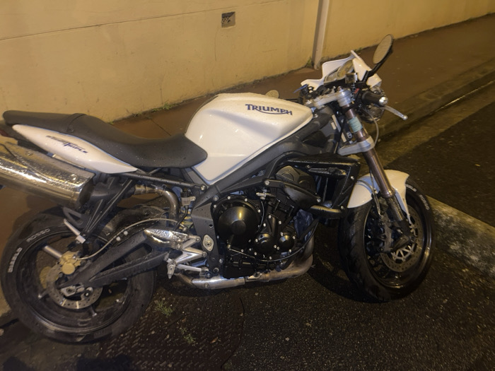 - "A white Triumph motorcycle, likely a Street Triple model, is parked on a wet street" by FM-aGcDR2, licensed under CC BY 4.0