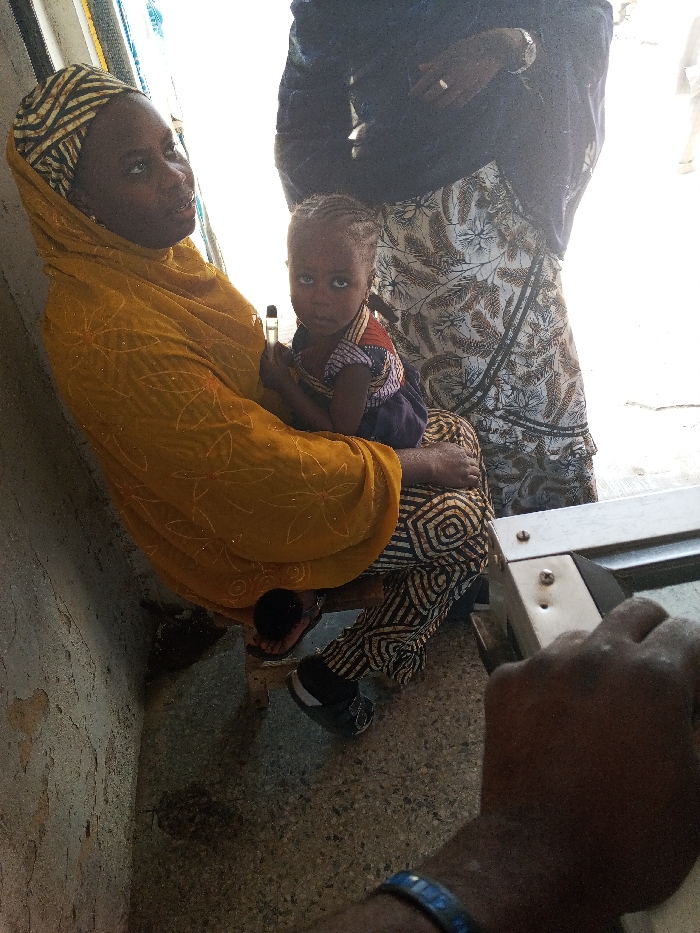 An indoor or sheltered scene in Fagge C, Nigeria, features three individuals and a partial fourth. A woman, dressed in a yellow embroidered headscarf and patterned top over dark patterned trousers, sits facing slightly right, holding a young child on her lap. The child, with braided hair and wearing a patterned top and dark trousers, looks directly at the camera, holding a small, clear vial with a dark stopper. In the background, a person is partially visible, wearing a dark top and a patterned skirt. In the lower right foreground, a dark-skinned hand with a blue bracelet rests near a metallic device or frame. The environment includes a textured, light-colored wall to the left and a concrete-like floor, under bright ambient lighting from the background.