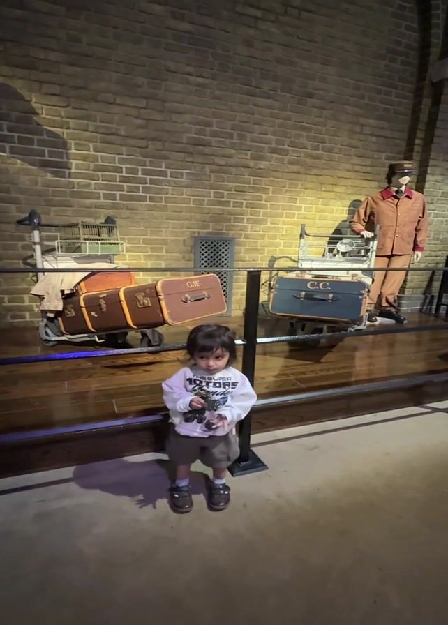 A young child stands in front of a brick wall display. The child is wearing a white long-sleeved shirt, shorts, and brown shoes. They are holding an object in their hands. Behind the child is a display featuring luggage on carts, with the initials "G.W." and "C.C." on the luggage. A mannequin dressed as a porter stands to the right of the display. The environment suggests a museum or exhibition setting. The lighting is soft, highlighting the brick wall and display items.