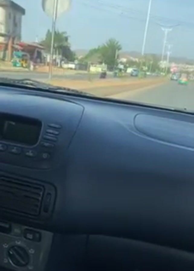 perspective of someone driving in a car in a town with other vehicles on the road. The dashboard is visible, with radio and air conditioning controls. The view through the windshield shows traffic on a multi-lane road, including auto rickshaws and other cars. Buildings and street lights line the road, and hills are visible in the distance under a bright sky.