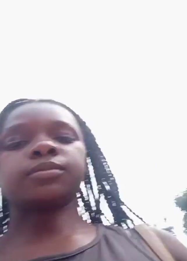 young woman with dark skin and braided hair looking at the camera. She is wearing a grey tank top with a colorful graphic on it. She has a brown strap of a bag over her shoulder. She seems to be walking on a dirt road. Behind her is a brick building with a metal door. There are trees and utility poles visible. The sky is overcast. The camera angle is slightly from below, giving a low-angle perspective.