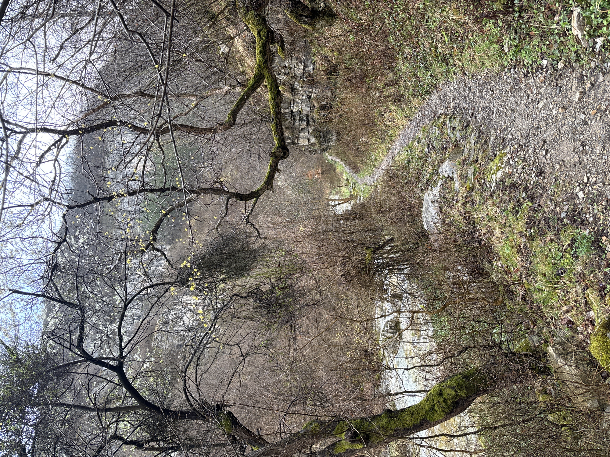 A dirt and gravel path runs along the right edge of the image, with vegetation and possibly a stream or narrow body of water on the left