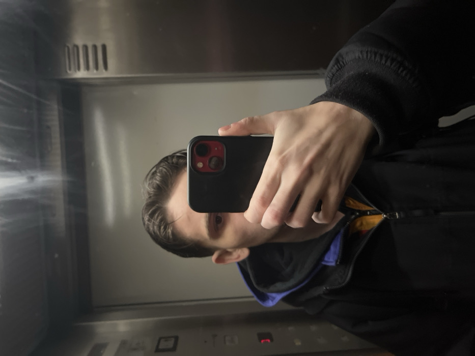 A lone individual is depicted in a mirror reflection, positioned within an elevator interior. The subject, a male appearing to be a young adult with dark, wavy hair, holds a black smartphone in his right hand, obscuring the lower half of his face. The smartphone case features prominent red accents around its dual camera lenses. He is dressed in a black zippered jacket layered over a blue hooded sweatshirt, with a segment of yellow fabric visible beneath the neckline of the jacket. The elevator environment includes a metallic control panel visible on the left side of the reflection, displaying an illuminated digital numeral "3" and various square buttons. The background walls consist of a light grey panel and a darker, metallic panel with a vertical vent-like structure. The setting is an elevator inside an unidentified building in Bragança, Portugal. No specific visual information allows for a more precise location within the city.