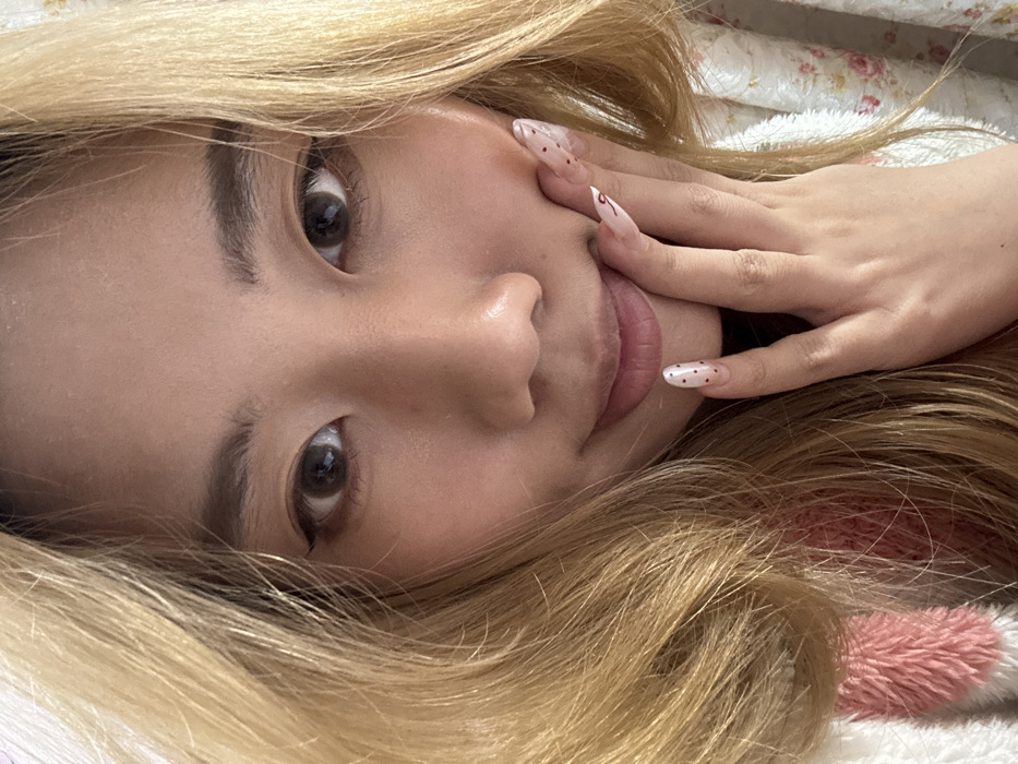 A close-up, chest-up portrait of an individual, likely female, is depicted within an unidentifiable indoor setting in Shapingba District, China. The subject possesses fair skin, dark brown eyes, and long, light blonde hair that partially obscures the frame edges. Black eyeliner is visible on the upper eyelids. A faint smile is present. The subject's right hand is positioned with fingers gently contacting the chin and lower right cheek. The fingernails are elongated, almond-shaped, featuring a translucent base with small dark red or black polka dots; one nail also displays a subtle red linear design. Partial views of two distinct garments are visible: a pink, textured fabric on the left and a white fabric with a pink and green floral pattern on the right. The background is out of focus, providing no specific environmental details beyond an indoor implication.