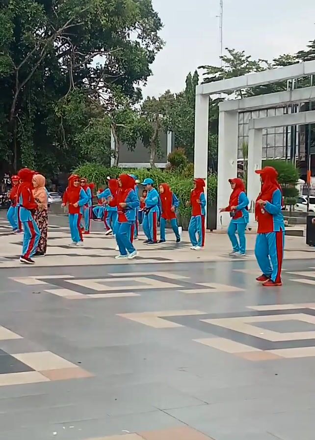 A group of about 10 women are performing a synchronized dance routine in an outdoor setting. The women are dressed in matching red and blue tracksuits with hijabs. They are arranged in a line on a patterned pavement with trees and a building in the background. The dance appears to be coordinated, involving arm movements and steps. The camera captures the scene from a static position with a slightly low angle, emphasizing the group's movements. The overall atmosphere seems lively and festive, with music playing.