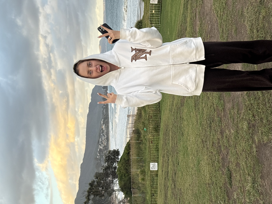 A female subject stands centrally on a grassy knoll overlooking Bulli Beach in Bulli, Australia