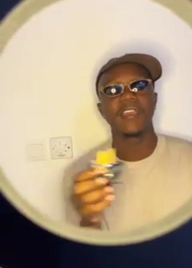 A man wearing sunglasses and a baseball cap stands in front of a wall with a light switch and electrical socket. He is looking directly at the camera, which is pointed at him through a ring light. He holds a yellow and white object with black accents in his hands, and appears to blow on it, then puts his hands up to his mouth. The scene is brightly lit and has an indoor feel. There is music playing in the background. The man has short hair and dark skin, and is wearing a plain light brown t-shirt and a pink wristband.