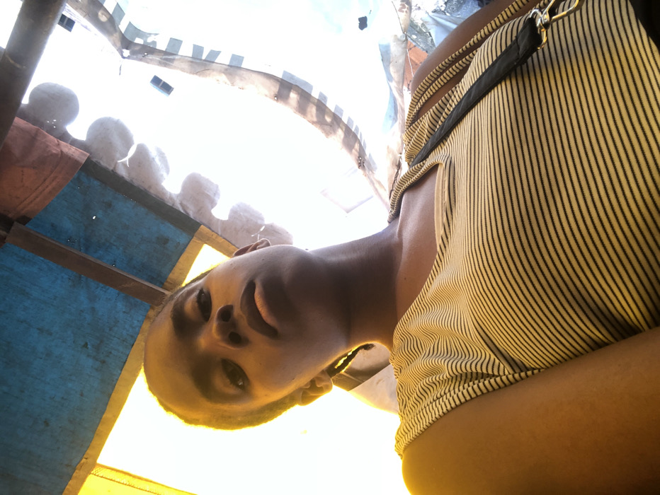 A low-angle photograph captures an individual positioned below the camera, looking upwards with a neutral expression. The subject has dark skin and short, dark hair. They are wearing a light-colored sleeveless top with thin horizontal dark stripes. A dark strap from a bag or garment is visible over their right shoulder. The background is dominated by an overexposed bright sky, suggesting an outdoor setting. Directly above the subject, an overhead structure is visible, constructed from various materials including blue, yellow, and translucent white fabric or plastic sheets, supported by unseen beams or framework. The scene is brightly lit from above. The location is Akpaka Forest Reser, Nigeria.