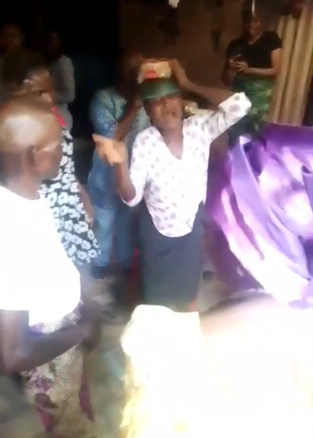 A group of people are gathered inside a building, possibly a home. An older woman wearing a white blouse, a dark skirt, and a green object on her head is at the center of the activity, waving her arms. A person holds a purple cloth near the camera. A woman in a green and floral dress smiles as she watches. A boy wearing a black shirt with red shorts stands among them. A man in a blue patterned shirt films the scene with his smartphone. Others are present, but their faces are not entirely clear. There is a red plastic chair near the woman waving her arms. The scene appears lively and celebratory.
