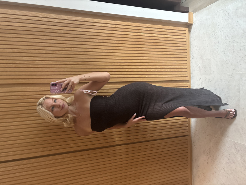 A blonde woman in a brown strapless dress is taking a selfie. The dress is form-fitting and has a slit. She wears flat sandals. She holds a phone with a pink patterned case in her right hand, adorned with rings. A pink beaded necklace rests on her shoulder. She is positioned in front of a light-colored wooden slatted wall with a tiled floor to the right.