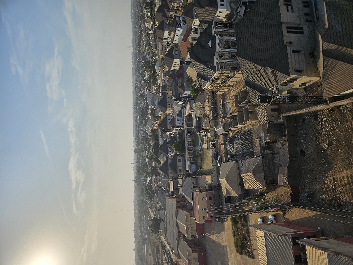 An aerial view showcases a dense urban sprawl under a hazy sky. Rows of buildings with varying roof textures dominate the landscape. Power lines cut across the lower portion of the scene. The sky transitions from a pale blue to a brighter horizon, indicating the sun's position. The image suggests a bustling residential area.