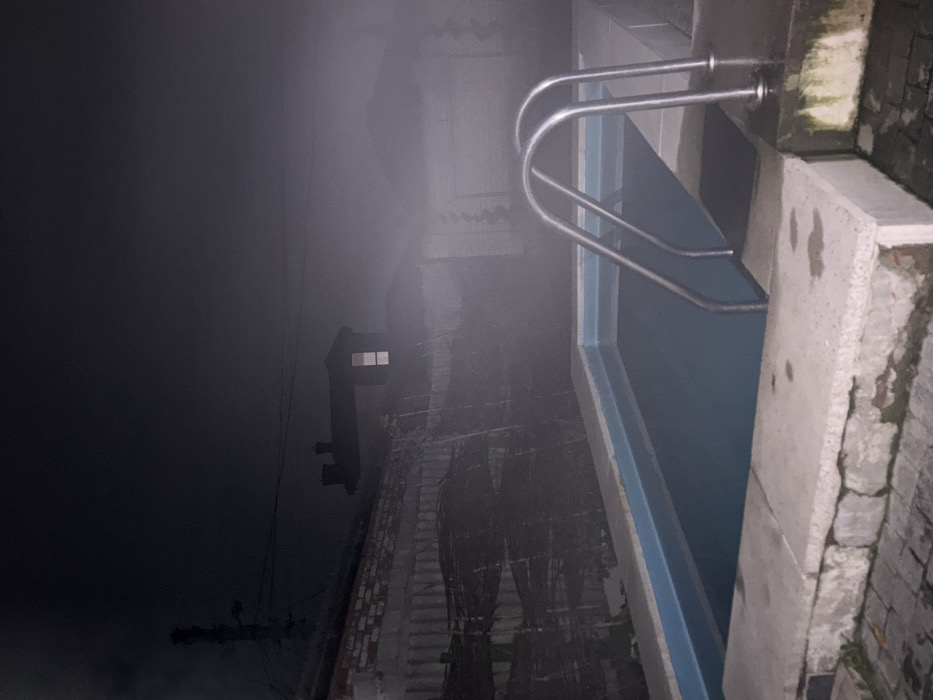 The image displays an outdoor swimming pool scene at night, under heavy fog, within the city of Kharkiv, Ukraine. The precise location within Kharkiv is not discernible from the image. The central subject is a rectangular swimming pool featuring a light blue liner and grey concrete coping. A two-rung stainless steel ladder descends into the water from the right edge. The immediate perimeter around the pool consists of dark paving stones. In the background, a low brick wall separates the pool area from a dark, possibly wooden, fence structure. Further behind, a two-story building with a dark roof and two chimneys has one rectangular window brightly illuminated. A utility pole with wires is visible to the far left. To the right background, an additional structure is largely obscured by the pervasive fog. No people or active subjects are visible in the scene.