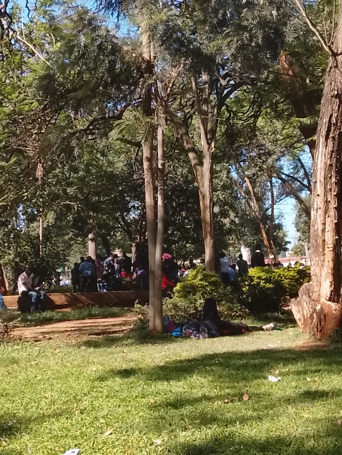 A sunny park scene with lush green grass and tall trees. A group of people are gathered in the background, some sitting on a low wall. In the foreground, a person lies on the grass with a dark covering, possibly sleeping or resting. The park appears lively, with people engaging in different activities amidst the natural setting.