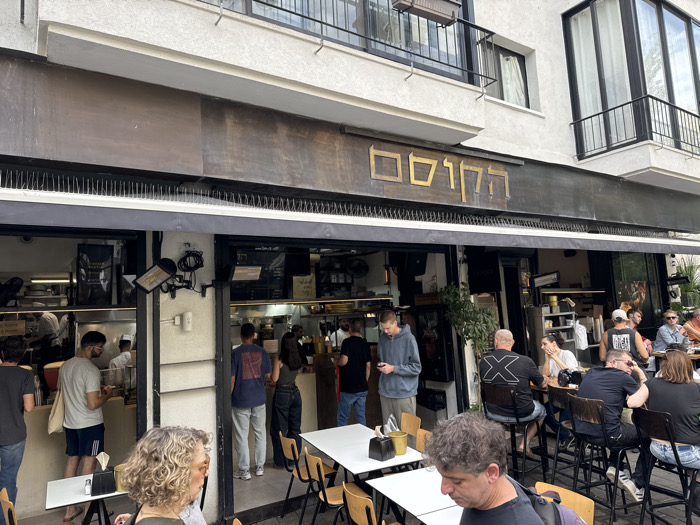 This image depicts the exterior of "HaKosem" (הקוסם), a restaurant located at Shlomo Hamelech St 18, Tel Aviv-Yafo, Israel