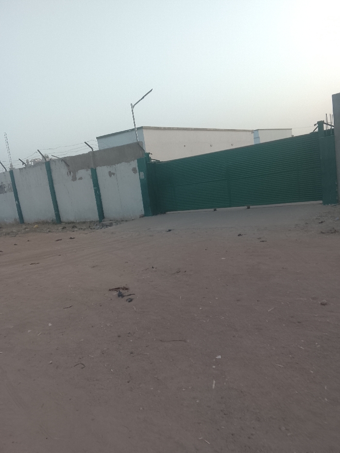 A large, green corrugated gate stands between white concrete walls with green accents. Barbed wire tops one wall. Buildings are visible in the background. The ground is dirt, with small debris scattered throughout. A light post is on the top-left side of the image. The sky is hazy.