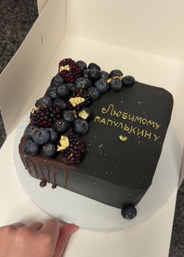 A hand moves a square black cake on a white plate within a white cardboard box. The cake is decorated with blueberries, blackberries, gold leaf, and drizzles of chocolate on one side. Gold writing on the cake reads "Любимому папулькину". The background shows a dark countertop, a metal object, and the corner of a white object.