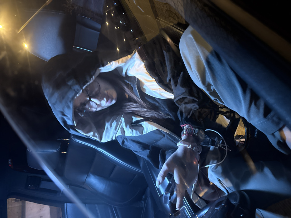 The image displays an individual, likely female, seated in the front passenger seat of a vehicle at night