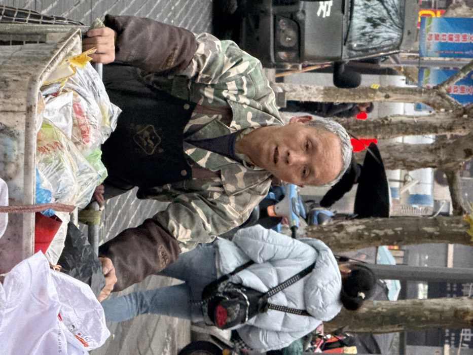 This image depicts an urban street scene in Beibei, China, under an overcast sky. In the foreground, an East Asian male, appearing middle-aged to elderly, with short, graying hair and a somber expression, directly faces the camera. He is wearing a camouflage long-sleeved shirt, over which he has a dark apron with visible straps and a chest emblem. Dark brown, possibly protective, sleeves or gloves extend up his forearms. His hands are positioned on the dirty handles of a white, rectangular, two-wheeled utility cart. The cart is heavily laden with assorted items, primarily plastic bags containing what appears to be discarded or recyclable materials. In the midground, to the right and slightly behind the main subject, a female figure is seen from the rear, walking away from the camera. She has dark hair tied in a bun and is dressed in a light blue puffer jacket, blue jeans, and a black backpack with studded shoulder straps. Further to the left and deeper within the midground, obscured by the bare branches of multiple trees, are indistinct figures, including one partially visible person under a black umbrella. Several distinct red blurs are also present in this area. A light blue scooter is parked behind the main subject. The background features a dark green utility truck or van, displaying the Chinese character "安" (An), parked on the far left. The street is lined with multiple bare-branched trees, some exhibiting white markings on their lower trunks. In the distant background, blurred urban buildings and vertical signs with Chinese characters are visible, along with a blue banner containing more Chinese text. The ground surface appears to be paved with a diagonal line pattern.