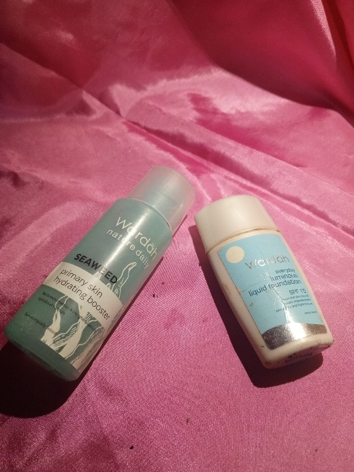 The image displays two skincare products from Wardah on a pink satin surface. On the left, a teal-colored bottle of "Wardah Nature Daily SEAWEED primary skin hydrating booster" is featured. To the right is a white bottle labeled "Wardah everyday luminous liquid foundation SPF 15." The foundation bottle shows signs of wear and residue.