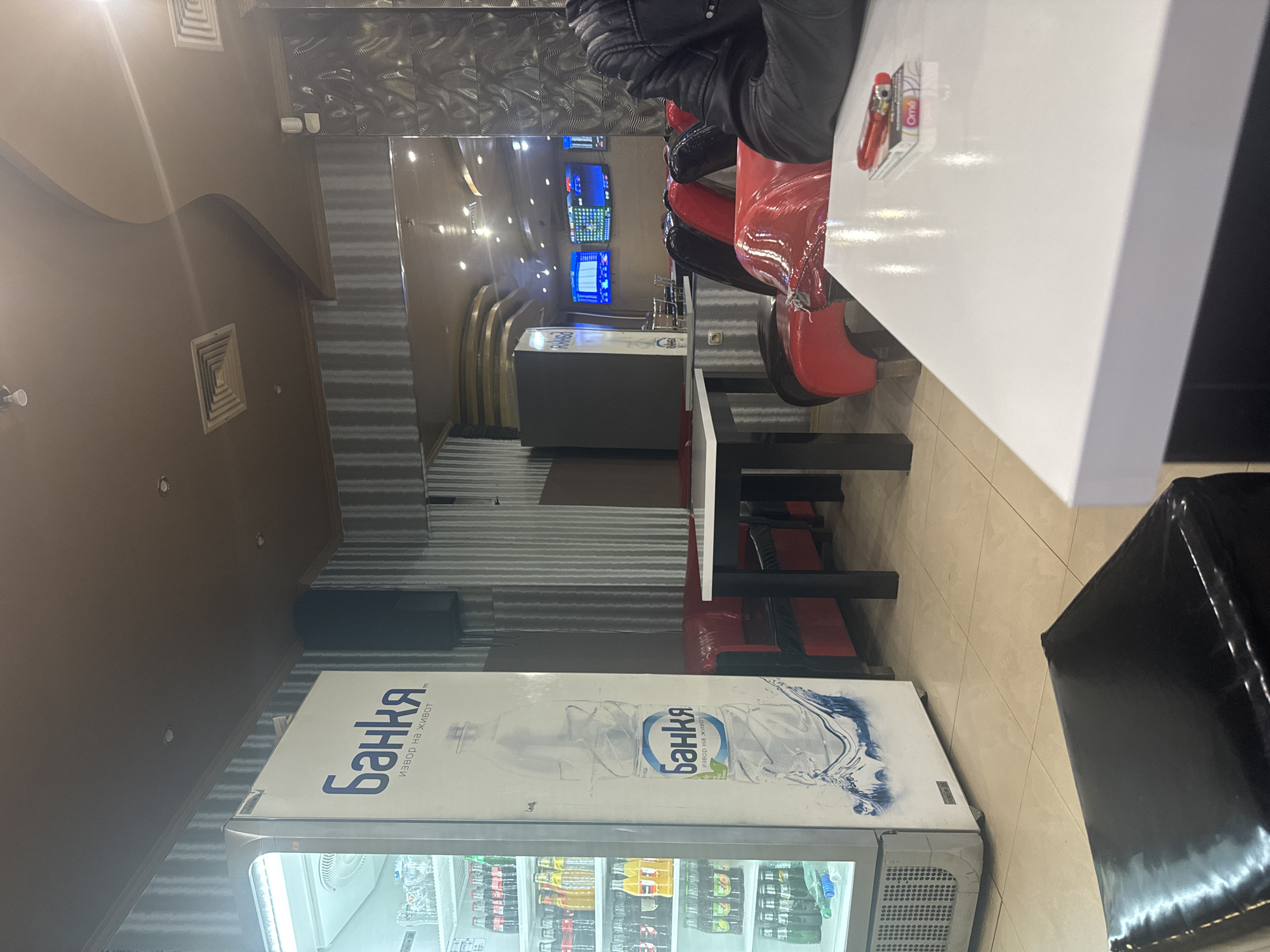 The image displays an interior scene of an establishment in Velingrad, Bulgaria, captured from a seated, slightly low vantage point