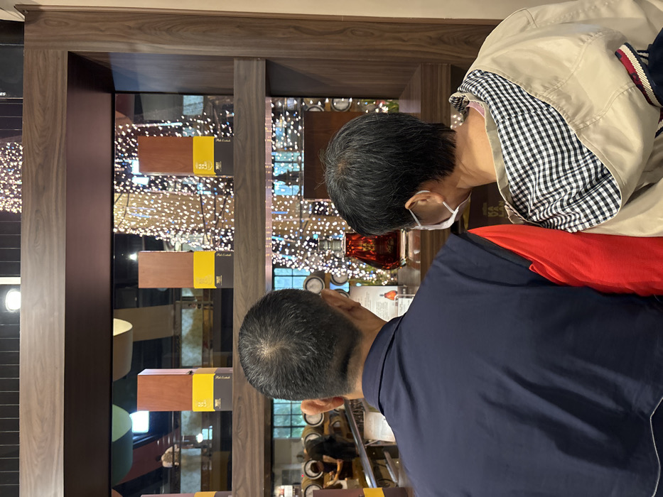 The image displays two individuals from behind within a commercial interior, identified as the Kavalan Distillery in Yuanshan, Taiwan. The person on the left is a male with short, dark, graying hair, wearing a navy blue sleeveless vest over a red long-sleeved shirt. The person on the right is a female with short, dark, graying hair, wearing a white face mask, and a beige jacket with a black and white gingham checkered lining over a pink top. Both individuals are looking forward, observing items displayed in a dark wooden shelving unit. This unit features glass shelves holding rectangular brown boxes with yellow labels on the upper level, and a prominent, ornate glass bottle containing amber liquid, branded "KAVALAN," on a lower shelf. Beyond the display, a large structure densely covered with numerous small, warm white LED lights creates a bright background. Out-of-focus elements in the distance suggest an industrial or storage area, including what appear to be barrels.