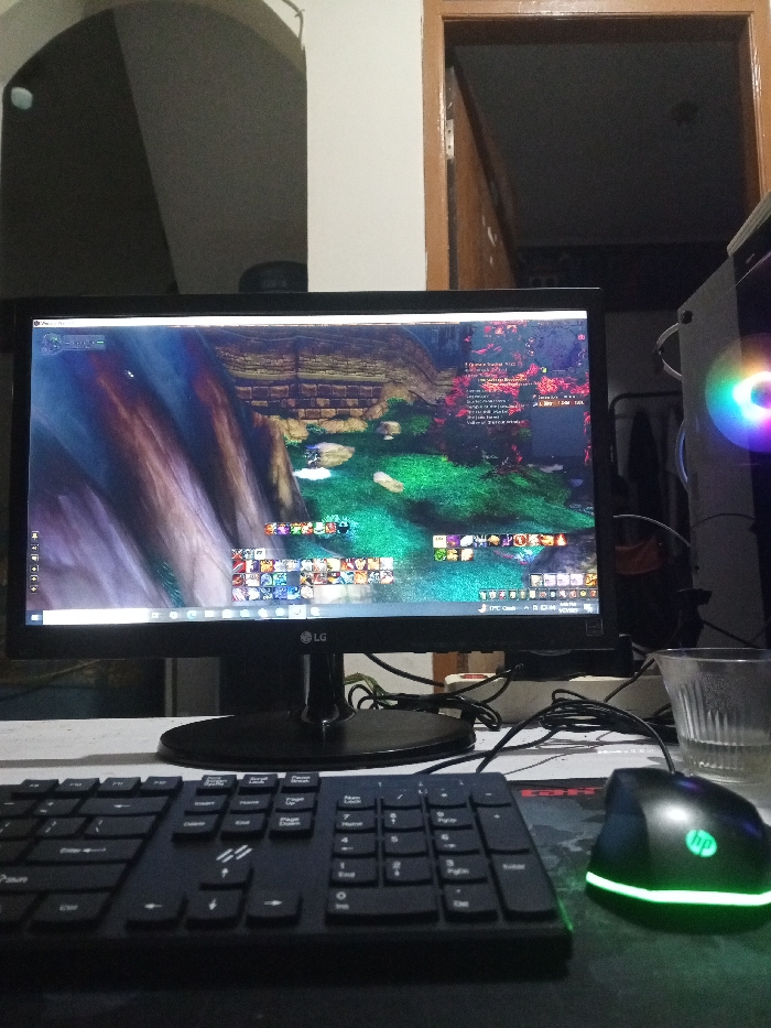 The scene is located in the city of Kpein, Liberia, depicting an active computer workstation in a dimly lit indoor environment. A black LG monitor displays a fantasy massively multiplayer online role-playing game (MMORPG), showing a vibrant green landscape with rocky structures and a detailed in-game user interface, including action bars, chat windows, and character information. In the foreground, a black full-size keyboard is positioned centrally, with an HP branded black optical mouse, illuminated by green LEDs, resting on a dark mousepad to its right. A black computer tower, emitting multi-colored RGB light, is partially visible on the far right. Numerous black cables are present on the light-colored desk surface, connecting the peripherals. To the right of the monitor, a clear, ribbed glass containing liquid is visible. The background features a light-colored wall with an arched opening on the left, where a faint, indistinct reflection of a human-like silhouette is discernible. An open wooden door frame on the right leads into a dark room. No discernible individuals are physically present in the immediate foreground.