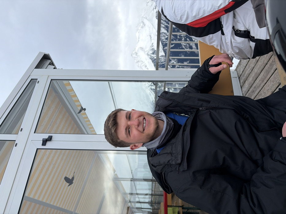 An outdoor terrace scene in Finkenberg, Austria, depicts a young adult male seated in the foreground, smiling directly at the camera