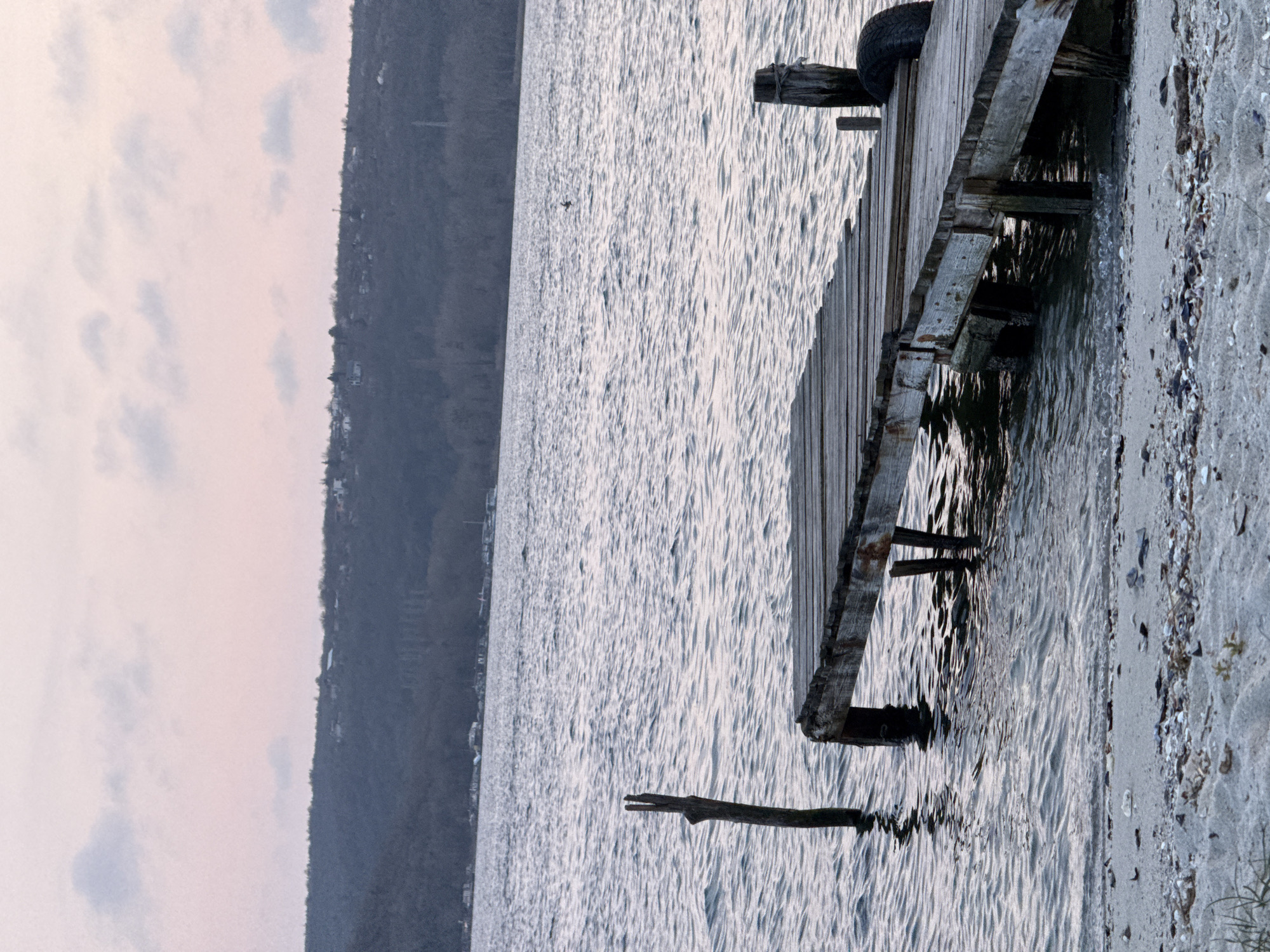 The image depicts a waterfront scene in Казашко, Bulgaria, during twilight hours. The sky above is a gradient of pale pink and light gray, featuring scattered, indistinct clouds. A large body of water, likely Varna Lake/Bay, occupies the midground, characterized by a rippled surface in muted blue-gray tones. On the distant horizon, a dark, tree-covered hillside rises, with numerous small buildings and structures visible along its crest and slope. In the foreground, a sandy beach is visible, littered with small shells, stones, and organic debris. A weathered, dilapidated wooden pier extends from the sand into the water, positioned to the right of the frame. The pier is constructed from rough, unpainted wooden planks, supported by vertical wooden posts submerged and exposed. A dark, presumably rubber, tire is attached as a fender to one of the pier's supporting posts. To the left of the pier, a solitary, bare wooden post or stake protrudes vertically from the water. In the middle distance of the water, a small, dark, indistinct object, possibly a bird or marker, floats on the surface. No individuals are present in the scene.