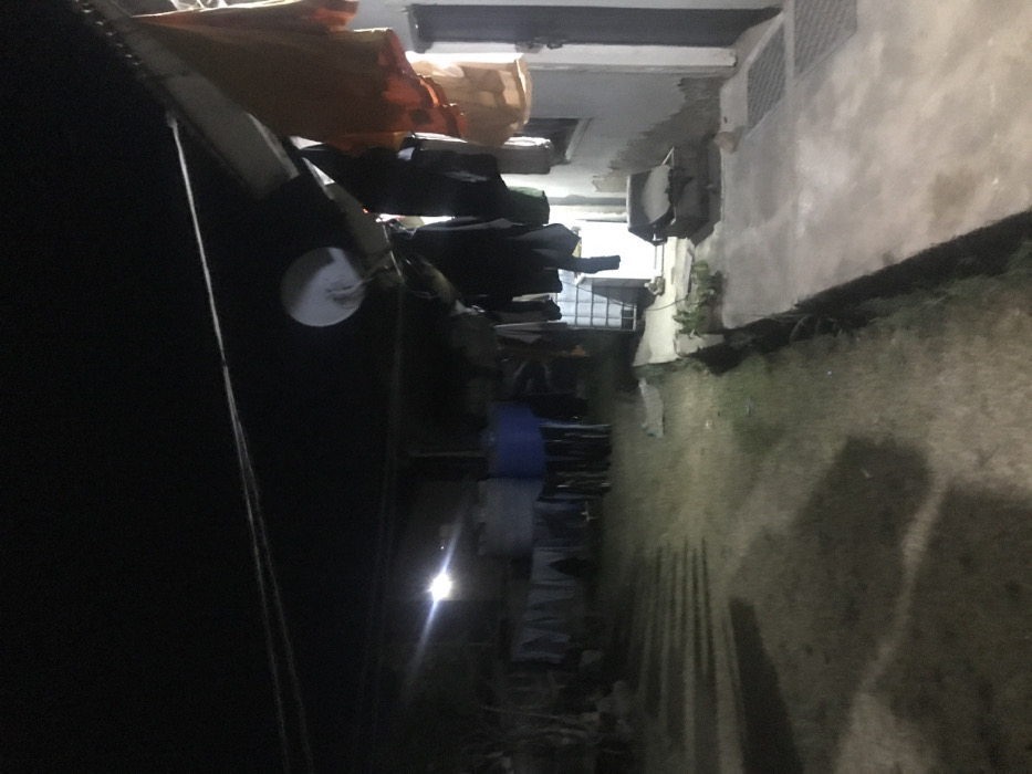 An exterior shot reveals a narrow outdoor area between buildings. Laundry hangs on a line strung above. Light fixtures and shadows cast elongated patterns on the ground. The buildings are plain, with glimpses of windows and architectural details. The ambiance is dark, suggestive of nighttime.