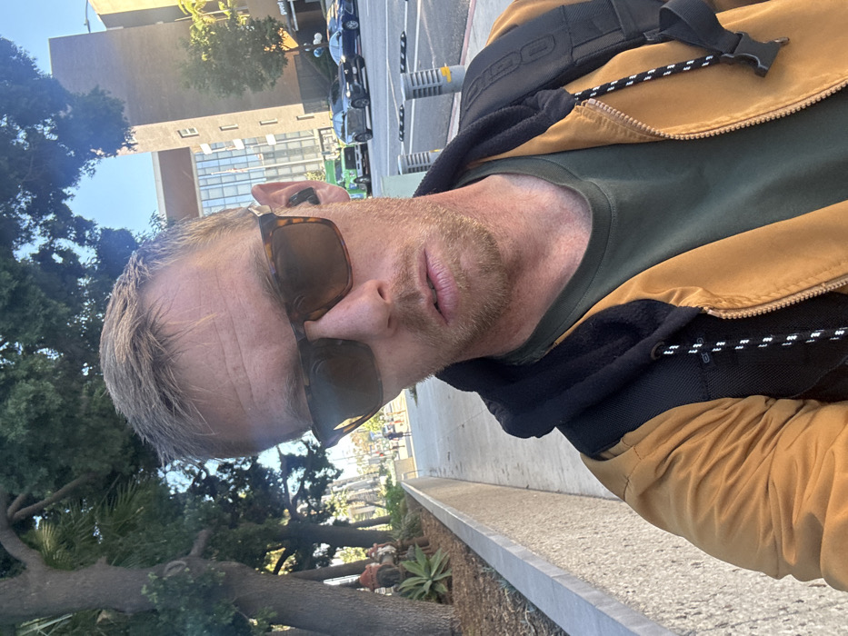 A light-skinned man wearing sunglasses, a dark green t-shirt, and a brown and black jacket with a black backpack stands outside on a sunny day. He has short blond hair and a light beard. Cars and buildings are visible in the background, along with trees and landscaping. The image is a selfie, taken at an angle. The man is facing the camera with a neutral expression.