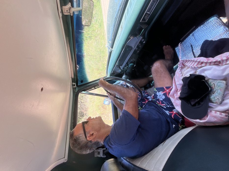 The image depicts the interior of an older model vehicle, located in La Barra, Uruguay, from the perspective of the front passenger seat. An adult male is operating the vehicle. He has short, graying hair, wears dark sunglasses, a dark blue t-shirt, and multi-colored swim trunks with red starfish and blue floral patterns. He is barefoot, with both hands on a dark steering wheel, gazing forward and slightly to his right through the windshield. The vehicle's interior features a light greenish-blue dashboard and door trim, an off-white headliner with a small central perforation, and a two-tone (cream and dark) driver's seat. A small, silver-toned winged ornament is affixed to the dashboard. On the front passenger seat, a black baseball cap covers a smartphone, alongside a light-colored patterned fabric and a small, green-patterned pouch. A silver reflective mat lies on the passenger side floorboard. Outside the vehicle, visible through the windows, is a bright, sunny environment dominated by tall green and yellowish grasses or brush, consistent with an unpaved road or natural area. A rearview mirror displays a white tag with dark text, which includes 'D.N.R.P.A.', hanging from its base.