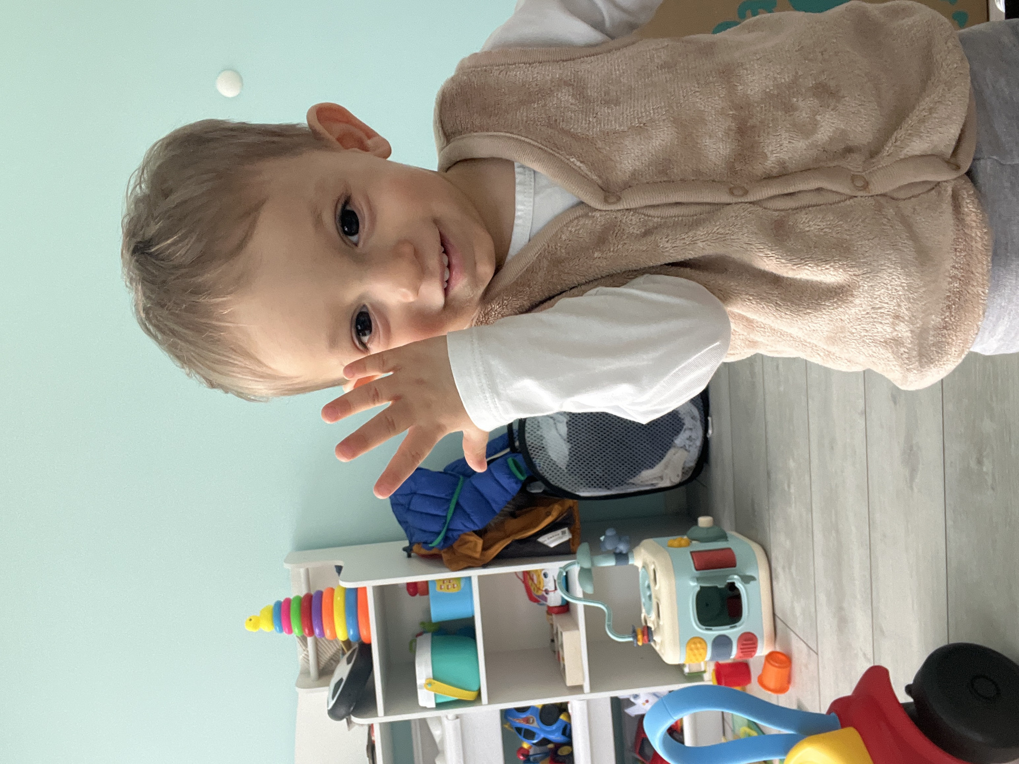 A young child stands indoors in Lozen, Bulgaria, smiling at the camera, his hand raised in a wave or gesture towards the viewer. He wears a white long-sleeved shirt and a brown, fuzzy vest. A white shelf filled with toys is behind him, including a stacking ring toy, buckets, and other play items. A blue and brown bag rests on top of the shelf. The wall is light blue, and the floor is light gray. A white light fixture is visible on the wall.