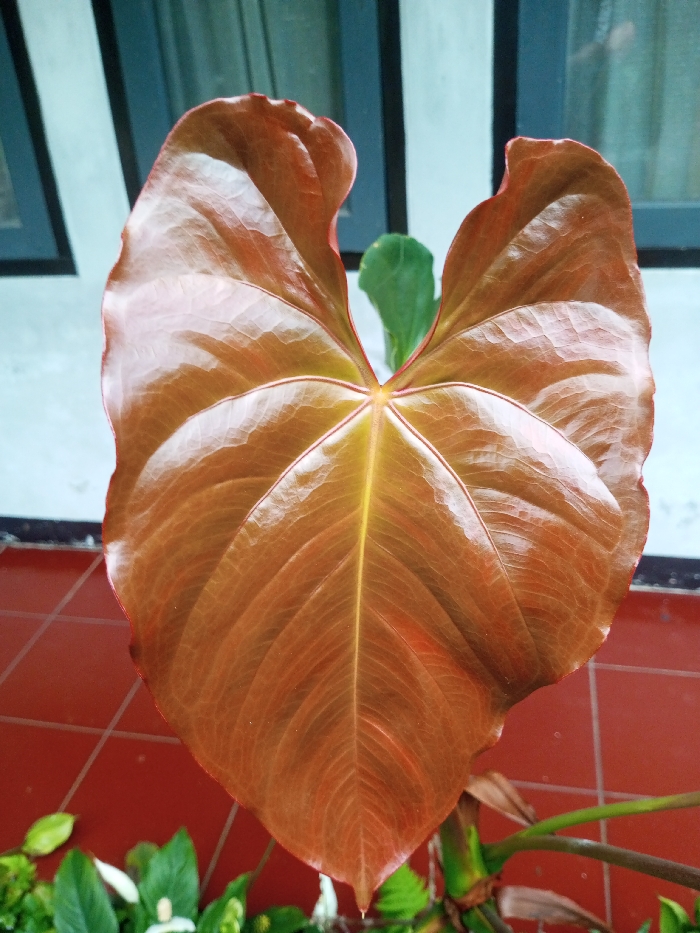 A single, large, heart-shaped plant leaf, approximately 25-30 cm in length, occupies the majority of the frame. The leaf exhibits a glossy, reddish-brown to copper coloration with pronounced yellow-orange primary and secondary veins. Its surface shows subtle undulations and reflections of light. Below the main leaf, at the bottom of the image, smaller green leaves and several small white inflorescences are visible. The plant stem is green, partially obscured, and appears to be secured. The ground beneath the plant is covered with terracotta-colored square tiles, approximately 10x10 cm, with dark grout lines. In the background, a light blue or off-white wall with a dark-framed window is visible. The window consists of multiple vertical panes. No individuals are present. No specific actions or interactions are occurring. The specific location within Tecuci, Romania, cannot be determined from the image.