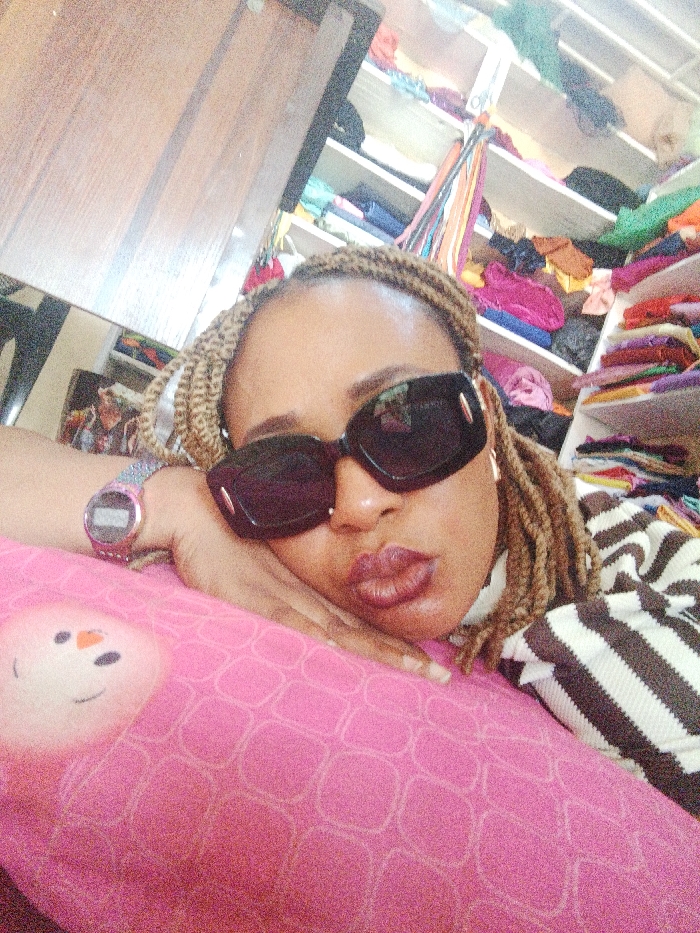 An adult female subject is depicted in a medium shot, her head tilted, leaning on her right hand which rests on a pink pillow with a white cartoon face design. She wears dark, rectangular sunglasses, a striped long-sleeved top, and a silver-colored digital watch on her left wrist. Her hair is styled in light-colored dreadlocks or braids, and her lips are pursed, coated with dark red lipstick. The background to the left features a light brown wooden surface. To the right, a white shelving unit holds numerous folded textiles and garments in a variety of colors, suggesting a retail or storage environment. This indoor scene is located in Sabon Tasha, Nigeria.