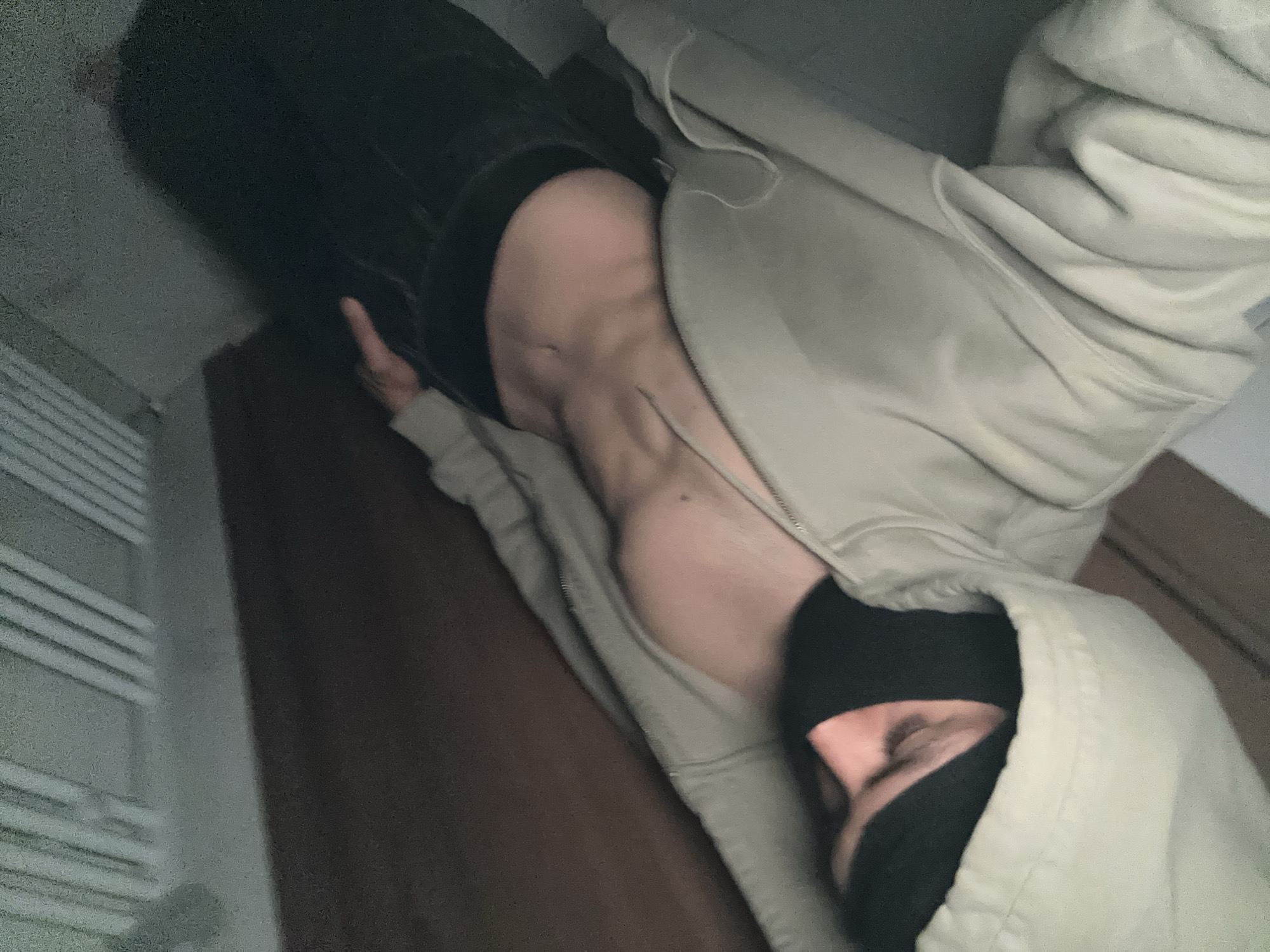 A person wearing a black balaclava and a light-colored hooded jacket lies on a dark brown surface. Part of their midriff is visible. The background includes a light-colored radiator and a dark wall. The image does not provide information about Ledenik, Bulgaria.