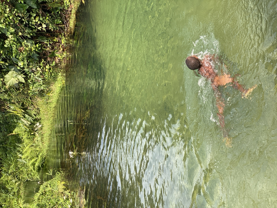 The image captures an outdoor scene in Ikot Obio Ata, Nigeria, featuring a clear, greenish-blue body of water, likely a natural stream or river